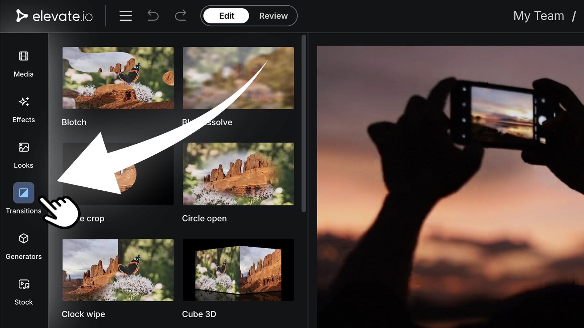 Sign up to elevate.io, the free online video editor, today and get access to dozens of cool, snappy, dreamy, and funky transitions — perfect for your social media and marketing videos. Let's go through each and every great transition in our collection.