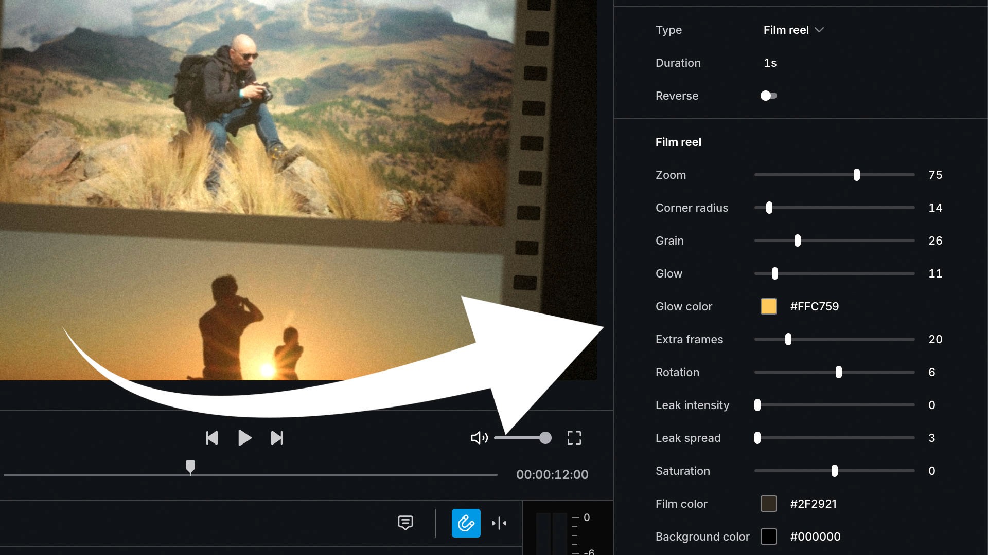 Change the zoom, grain, glow, rotation, film color, and much more with simple slider controls to craft the perfect film roll transition for your video.