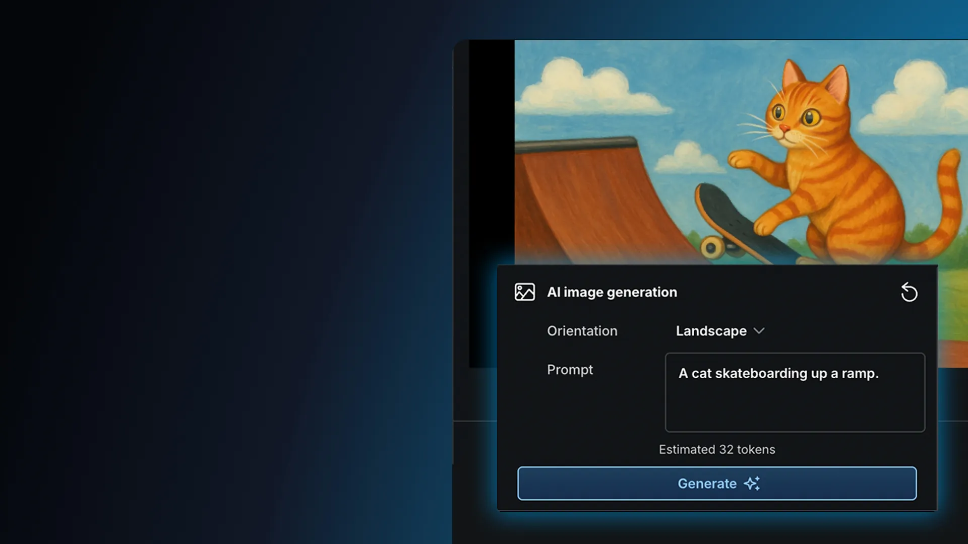You’ll see a window pop up in the top right of the editor. Describe the image you want in the prompt box - it can be as specific or as wild as you want.