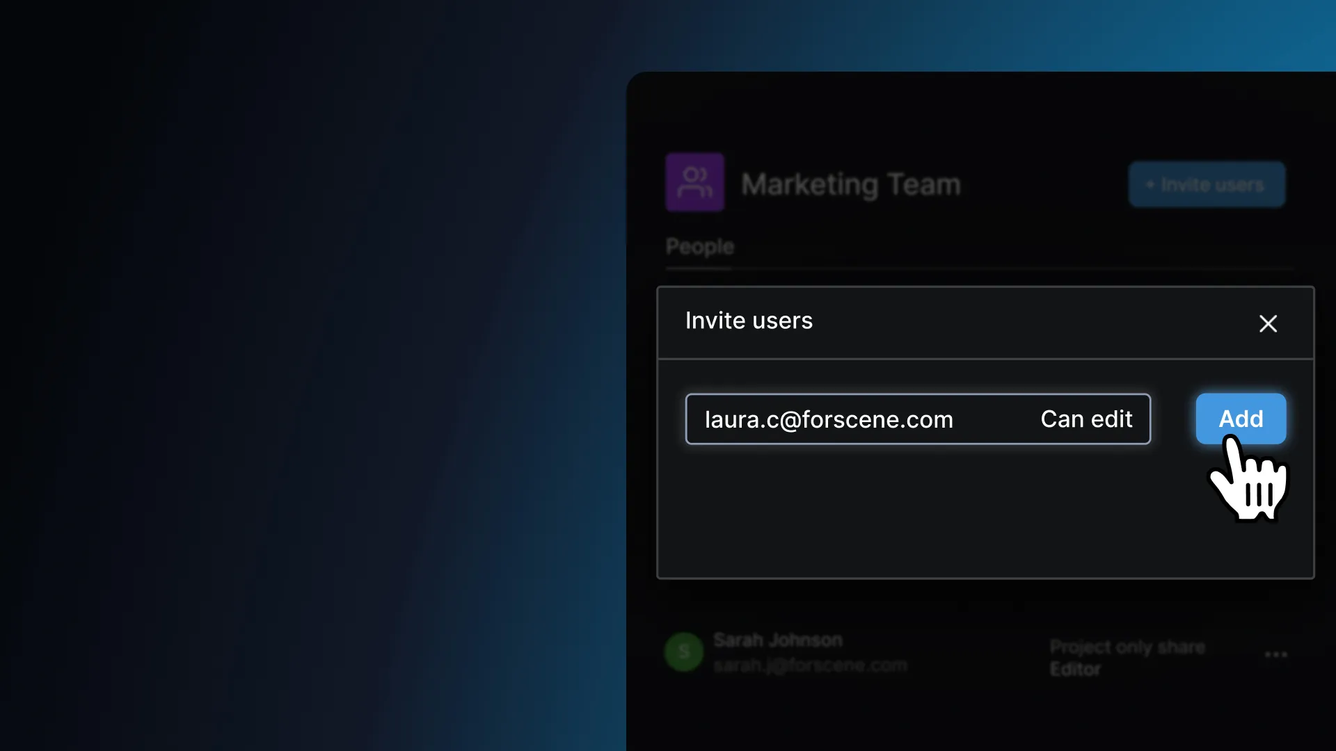 To add someone, click the blue invite users button on the top-right. A small window will pop up on your screen. Enter their elevate.io account email, click 'Add', and you're done. They will get an email letting them know that they've been invited. Your new member can easily switch between their own team and yours in the Team dropdown on the left-hand panel in the elevate.io homepage.