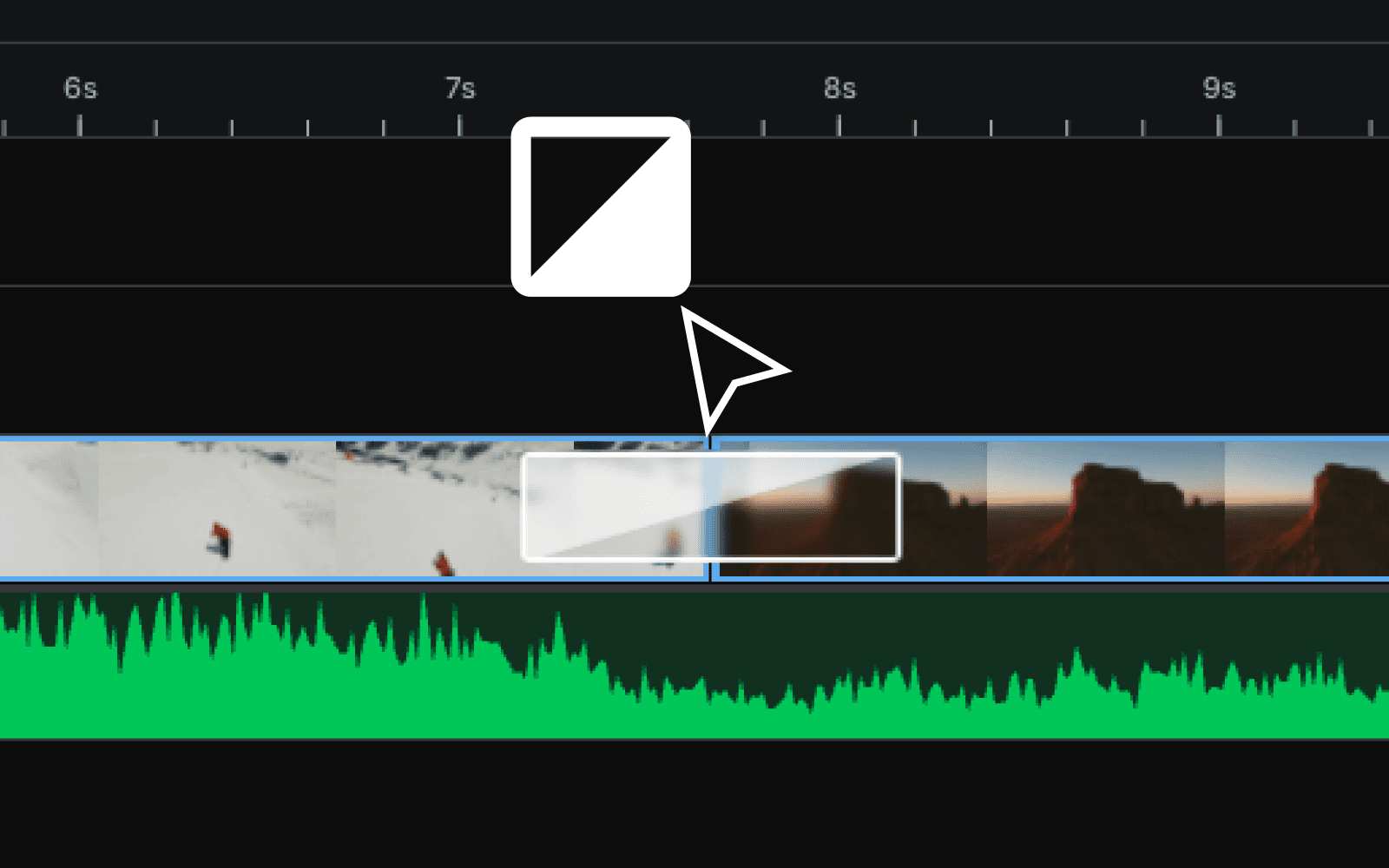 Let's start with a basic dissolve - we can just drag and drop that right onto the transition point. You can snap the transition block to the left side or to the right side of that transition point, or centre it over the middle.