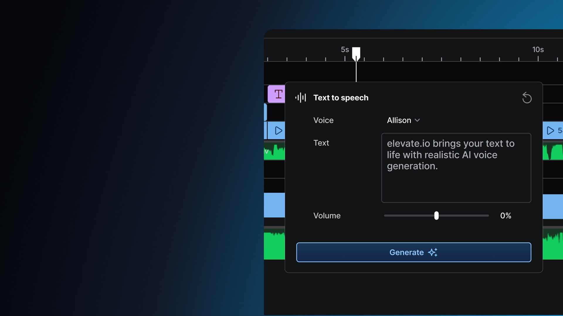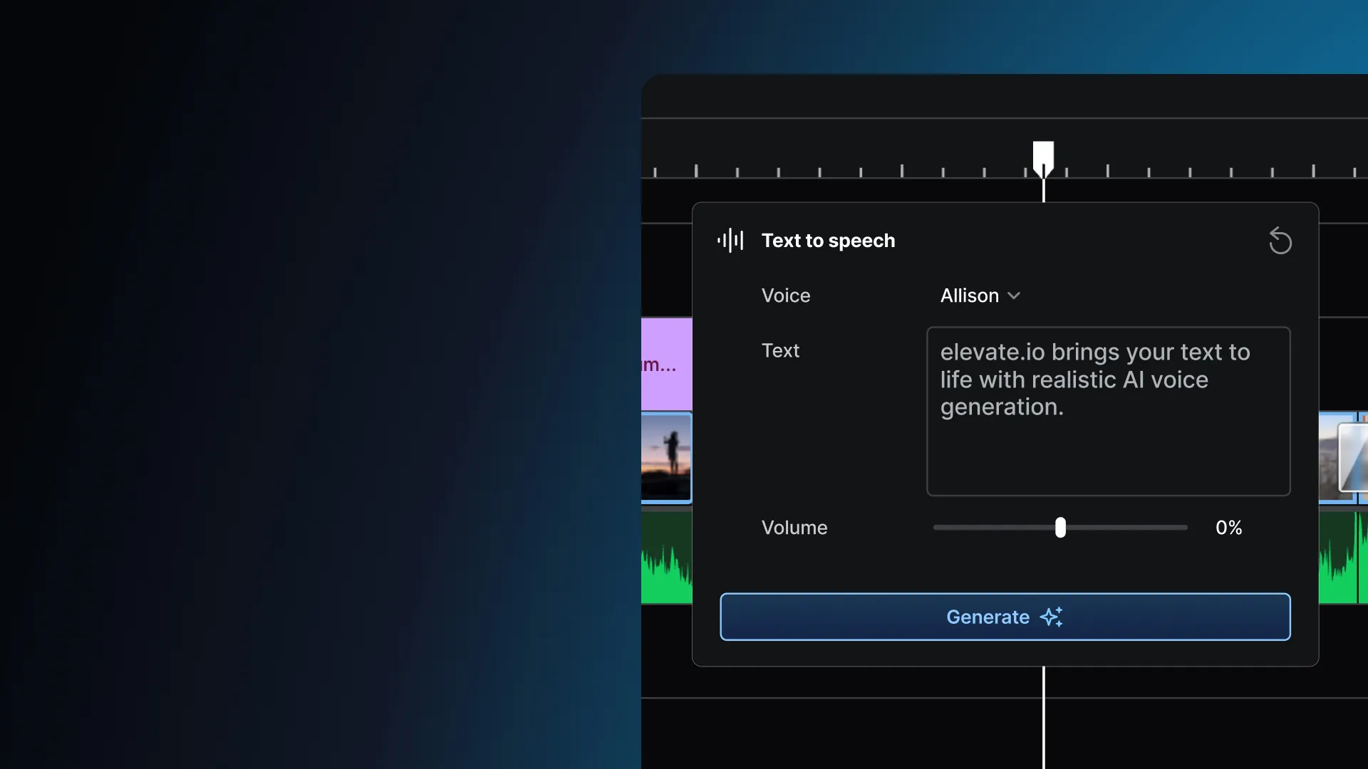 Once you’re happy with your script, voice, and volume settings, hit ‘Generate’. Then, just playback your video to hear the 'Text to speech' in action.