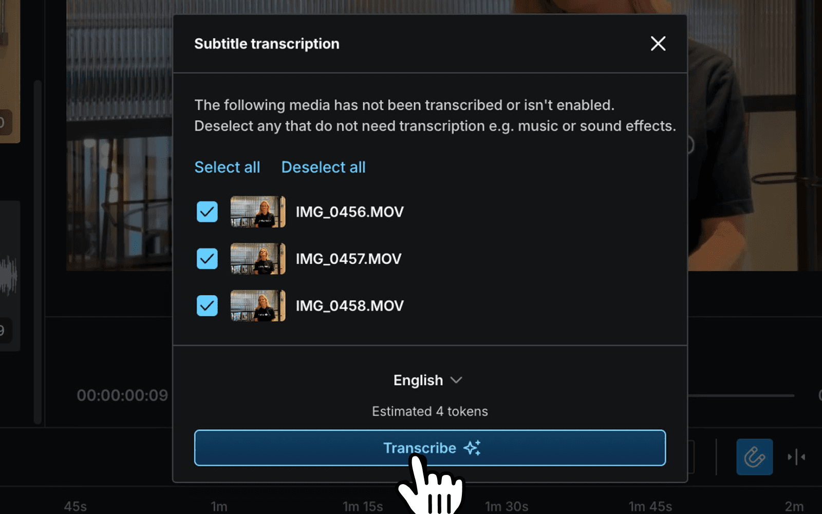 A modal will pop up, letting you choose which clips to transcribe, giving you full control. This is especially handy if you only want subtitles for part of your video.