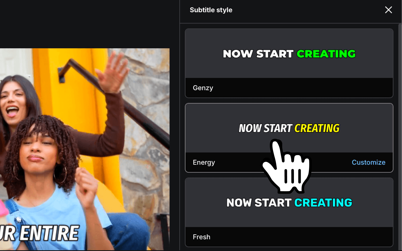 To further customize your subtitles, hover over the subtitle card and hit 'Customize' to open the full design panel. From there, you can adjust the font, size, color, highlights, and more.